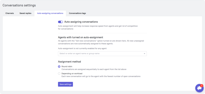 The tool can distribute conversations either in a queue or based on each agent’s current workload. This helps achieve a fair and balanced distribution of incoming requests across all support agents, decrease response time, and eliminate competition for new conversations.