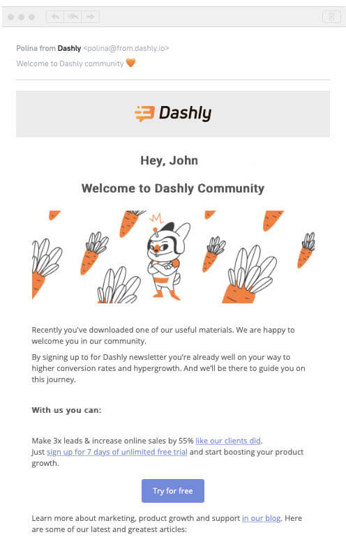 The more actively clients use your service, the better you have to show them the value of your product. It’s important to make sure that the user gets your message at the right moment. In Dashly, we never tell new users to start with a difficult message sequence, as they won’t get any value from this. At the very beginning, we show them how to collect leads data and create leads segments based on this. Our onboarding sequence consists of six emails. And these letters teach users the most important tips which will help them get the maximum benefit from the service.
