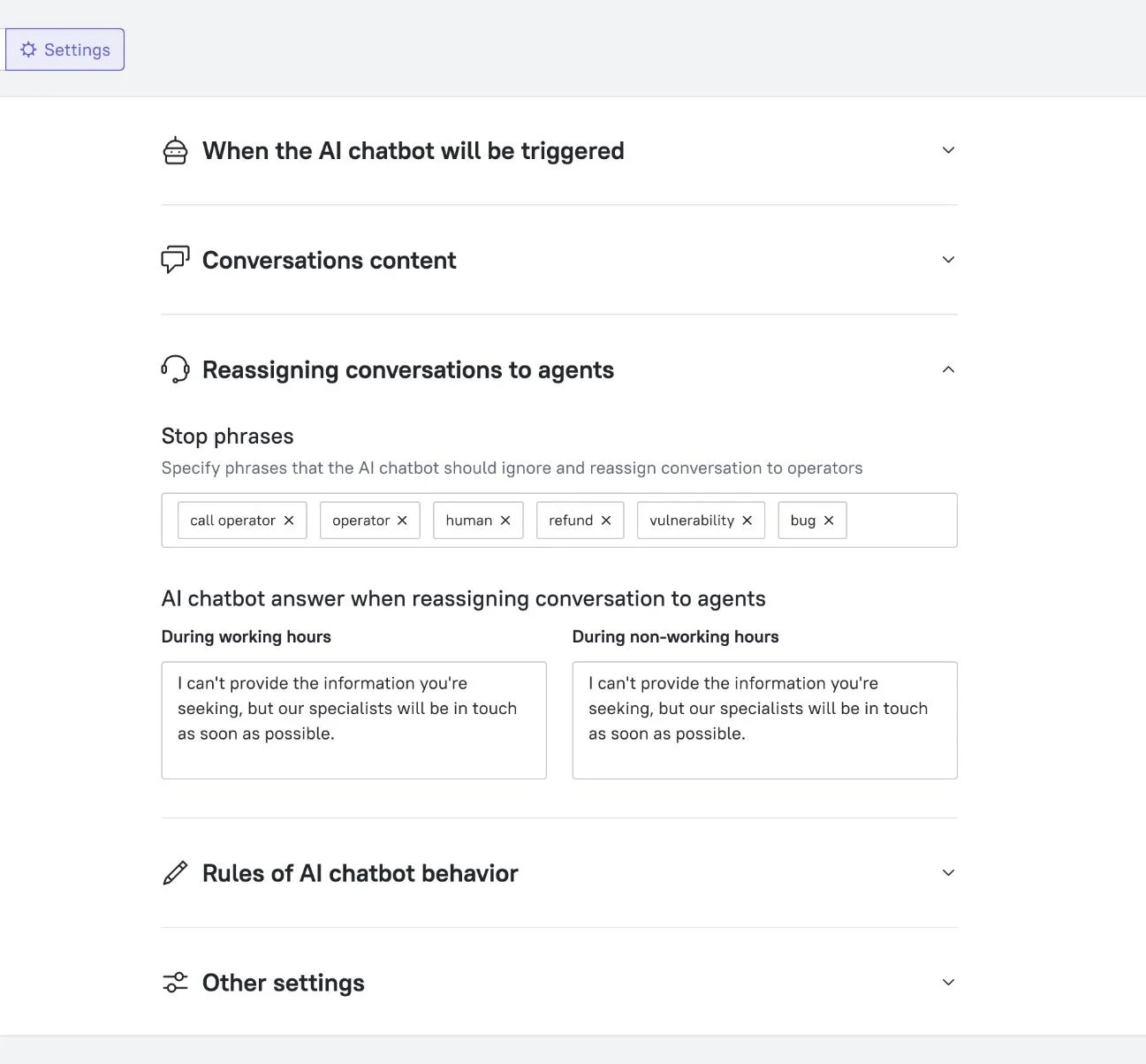 One of the strengths of Dashly’s AI support agent is how flexible it is. You can adjust: