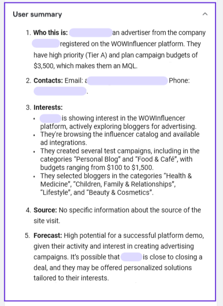 AI Lead Insight acts as your data intelligence layer. It collects every piece of information about website visitors: browsing history, CRM records, LinkedIn profiles, product usage, past conversations. And then the agent transforms it into complete customer profiles. It determines visitor intent (high/medium/low) and warmth level (cold/warm/hot) in real-time, powering smart decisions for all other agents. And your managers.