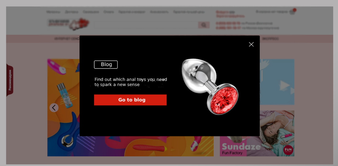 Our client has a “Sexopedia” section on their website. It has a separate domain name, and it decreases the blog’s traffic significantly. To draw more attention to “Sexopedia” we set up a pop-up and launched A/B testing of the pop-up’s design and location. The offer in both tools was the same.