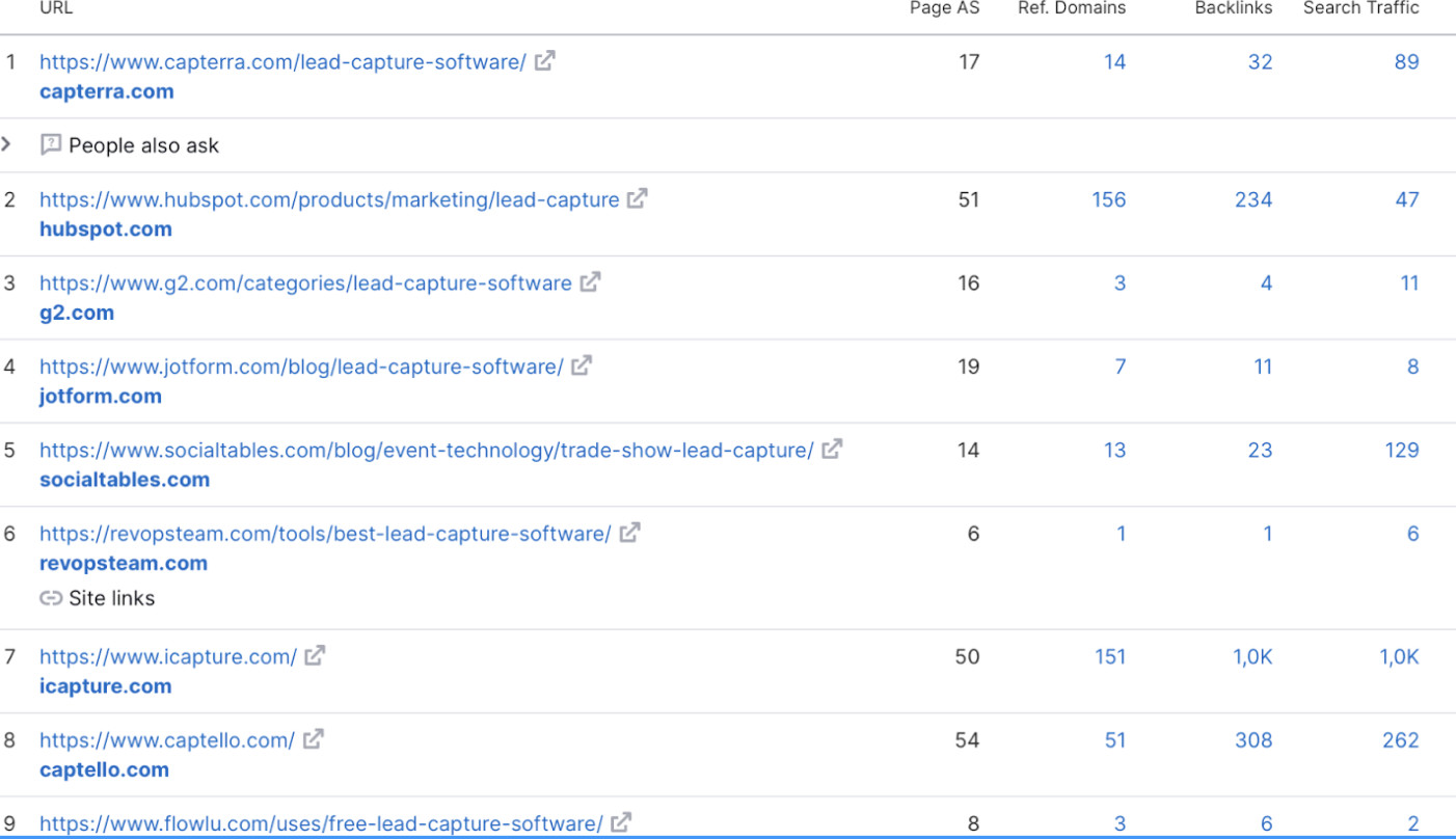 Approximately 70% of the URLs contain our query, which confirms the idea that lead capture software is definitely a separate hub article. Page Authority (PA) and backlinks are also manageable.
