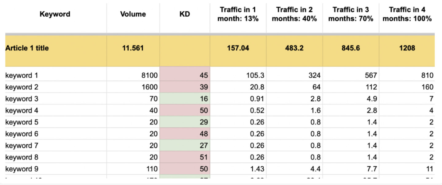 6. In the “in 4 months” column, each cell opposite the keywords has its own formula (determining how much traffic the article will ultimately receive depending on the KD of the keyword:
