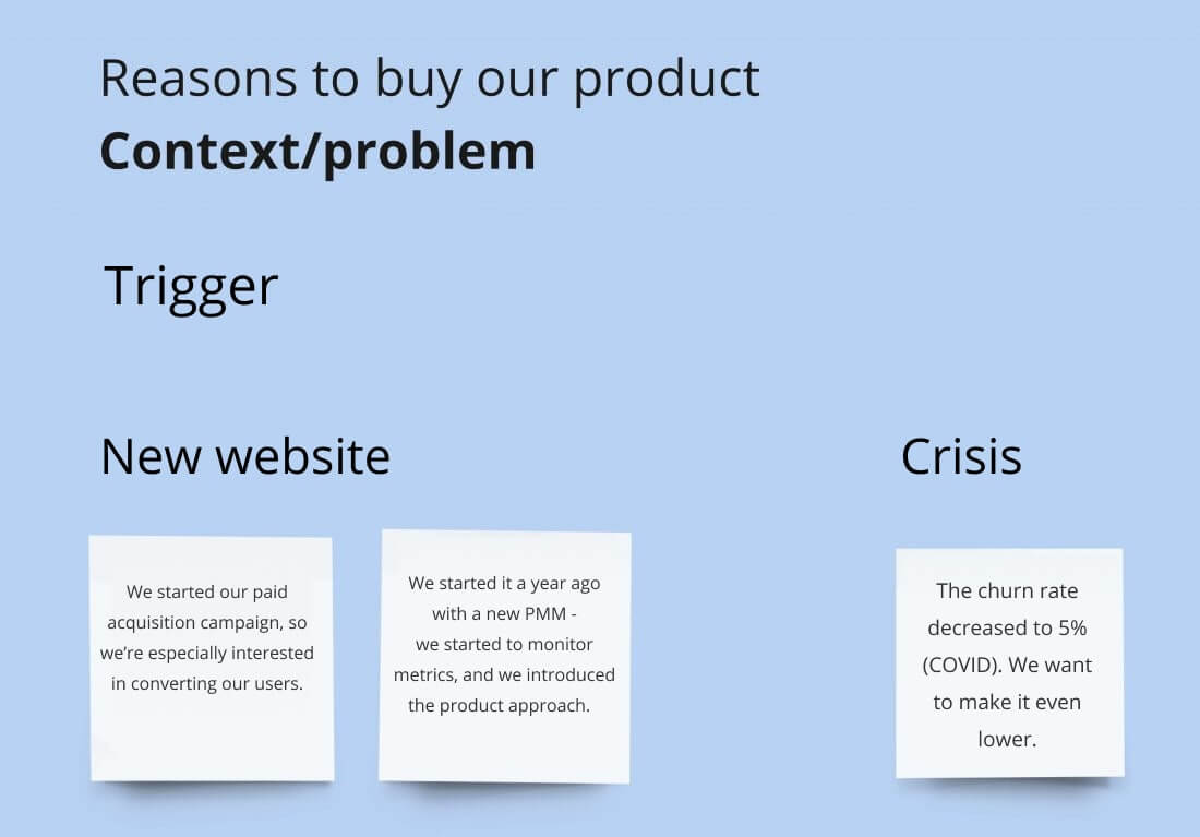 Then, we began grouping similar quotes, and we got several clusters. That’s how we identified major challenges and contexts when users chose us.