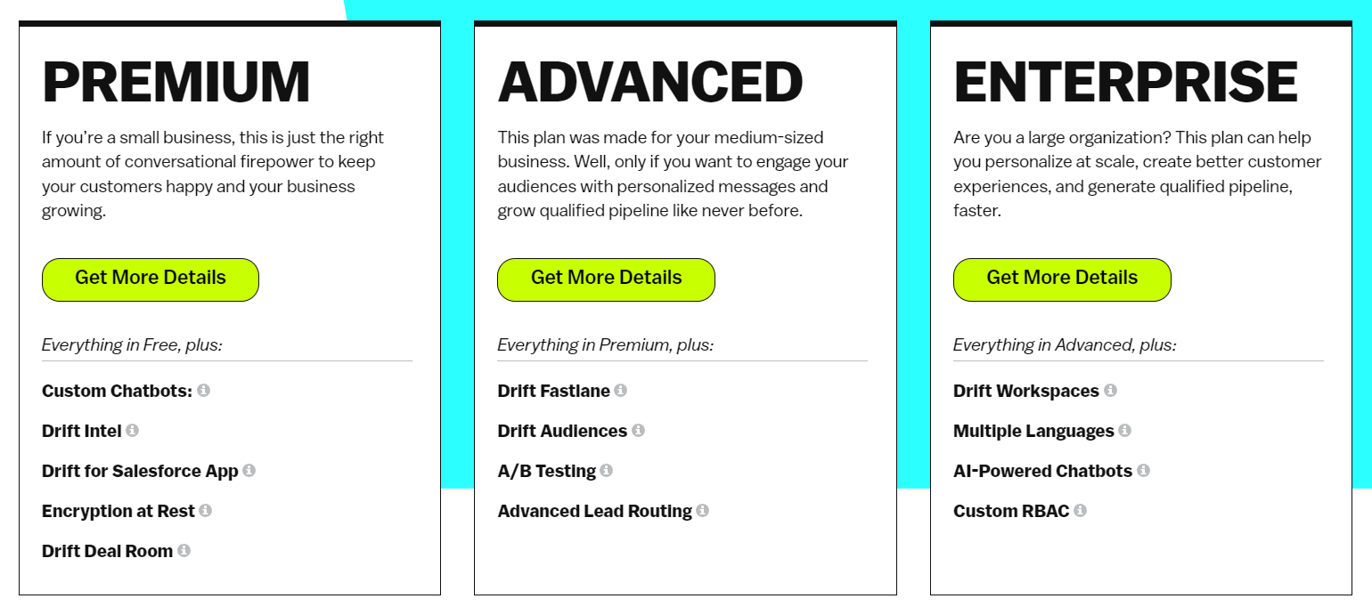 According to user’s reviews, a price may vary from $400-1500/month. But mind that Drift offers annual contracts.