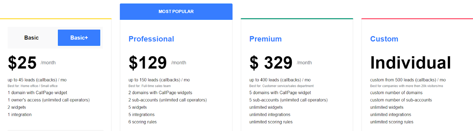 CallPage offers four paid plans for their lead generation software, starting from $25/month. The choice of the plan will depend on the number of websites you’d like to install CallPage, active users, and features you’d like to get.