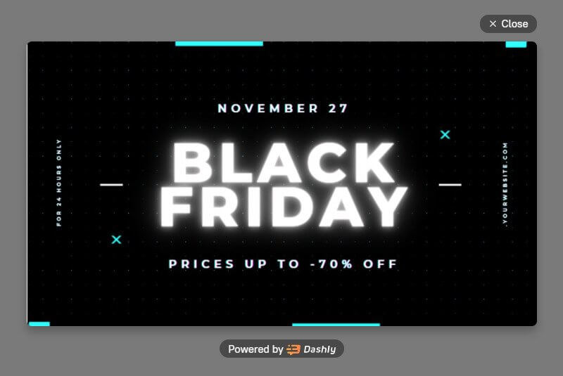 Using Dashly Pop-up Builder, I created Black Friday pop-ups: Free background + text and clickable button from the pop-up builder.
