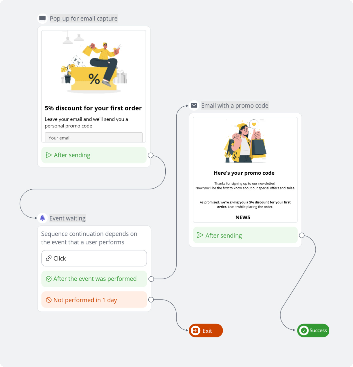Manage funnels quickly and transparently. Built-in statistics show what percentage of users perform the target action and which ones drop out of the sequence. Identify bottlenecks in sequences and strengthen your communication with customers.