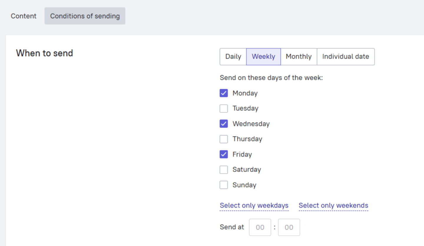 You can access scheduled messages from the additional section in “Triggered messages”Example of scheduling a message for specific days of the week